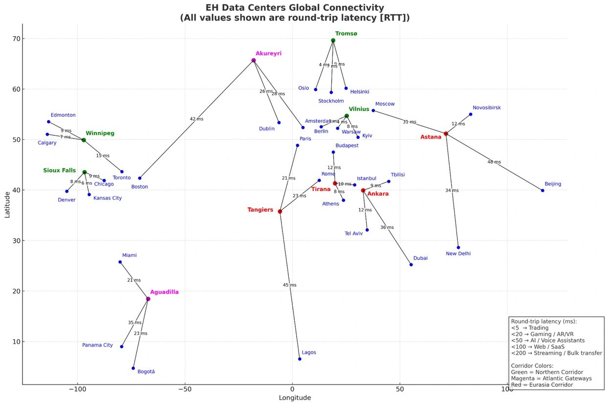 EH Data Centers is creating a network of powered shells across the globe. These locations will provide the data center operator with a combination of benefits including low corporate taxes, tax incentives, low energy costs, service level utility agreements, free cooling where possible, and low latency to key destinations for the support of AI, gaming, remote desktop, VOIP, web browsing, streaming, and large file downloads.